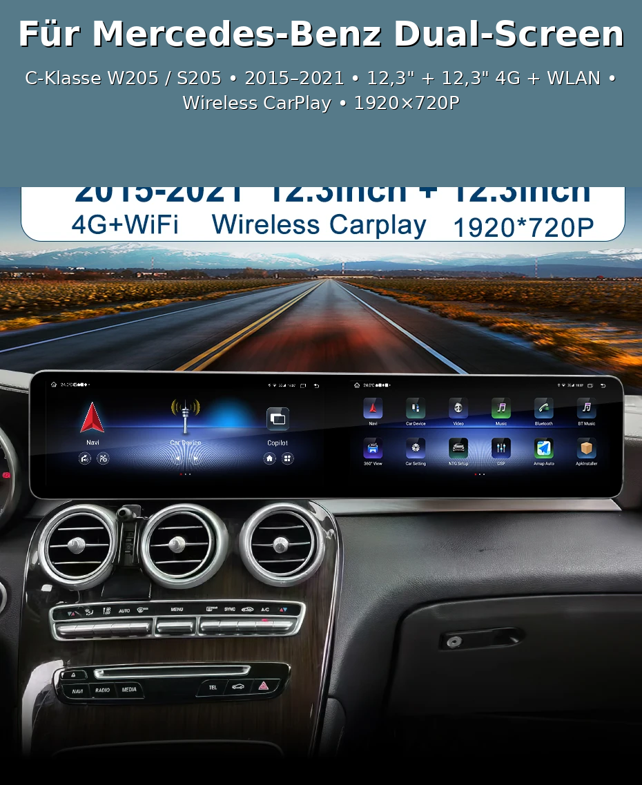Startseite » Android Displays » Displays für Mercedes » C-Klasse W204/W205/W206 » 26" Android 14 Dual-Screen Display für Mercedes C-Klasse/GLC W205 2015–2021 NTG 5.0/5.5/6