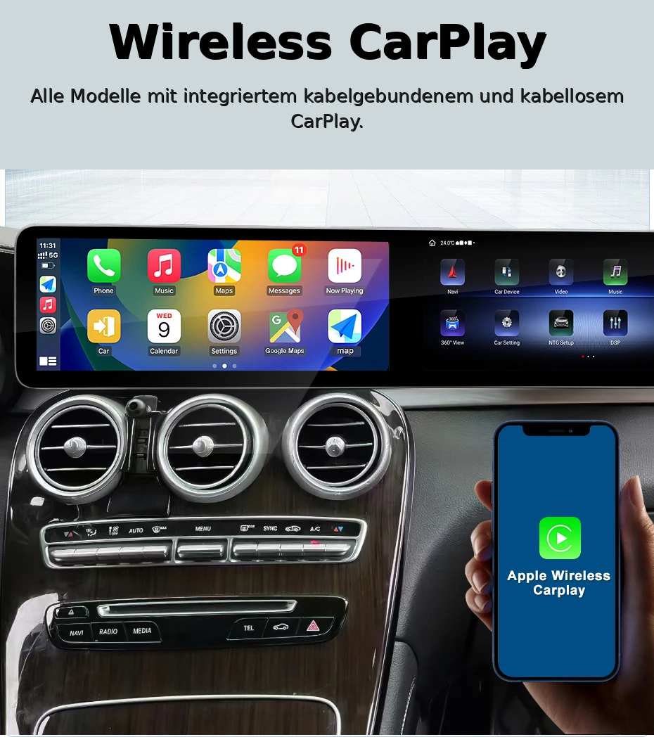 - Wireless & kabelgebunden: Apple CarPlay + Android Auto