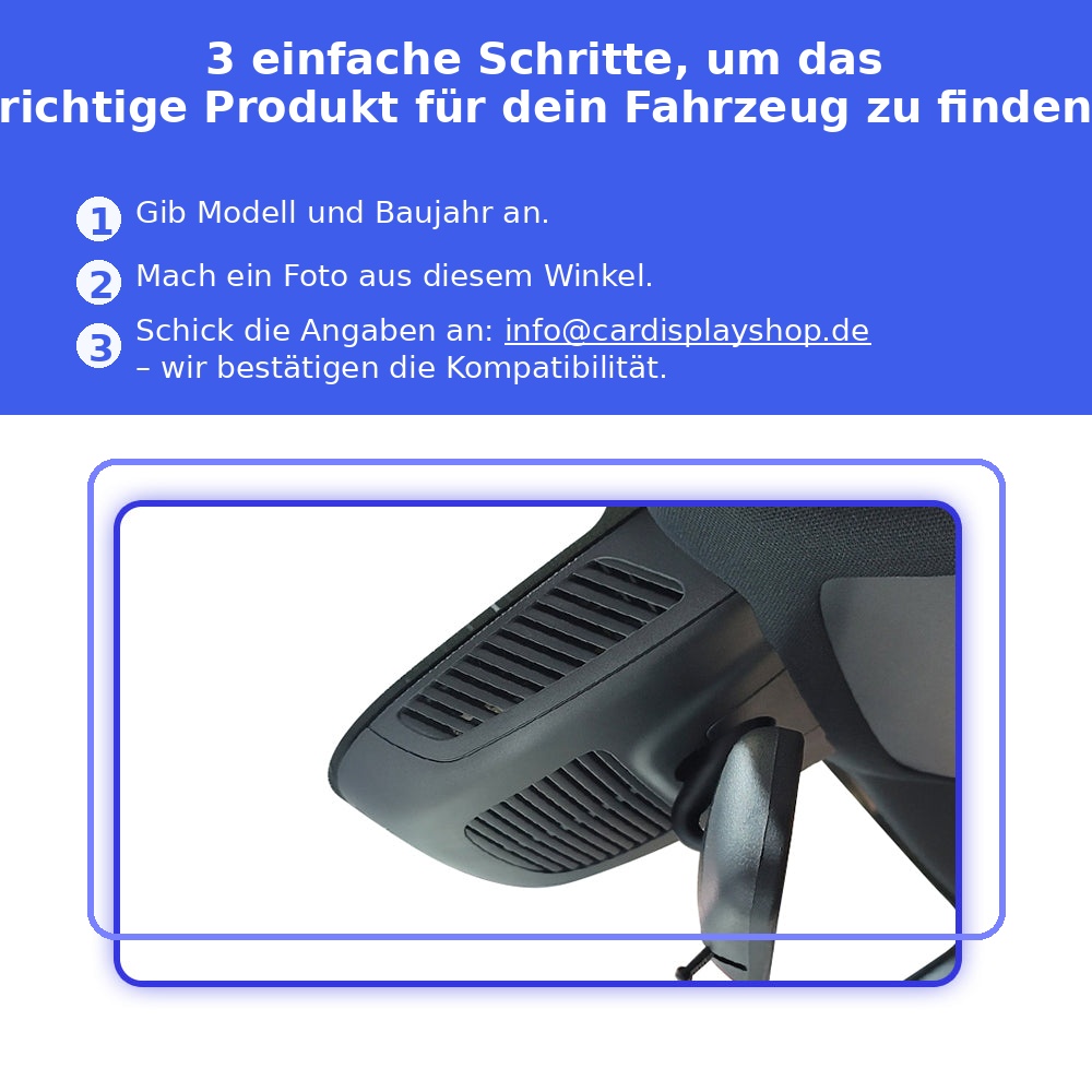 DE: Für eine reibungslose Abwicklung teilen Sie uns bitte nach dem Kauf über die Nachrichtenfunktion folgende Infos mit: Fahrzeugmodell, Baujahr sowie ein Foto der Spiegel‑/Kameraverkleidung. Die Bearbeitung/der Versand erfolgt erst nach Erhalt dieser Angaben.